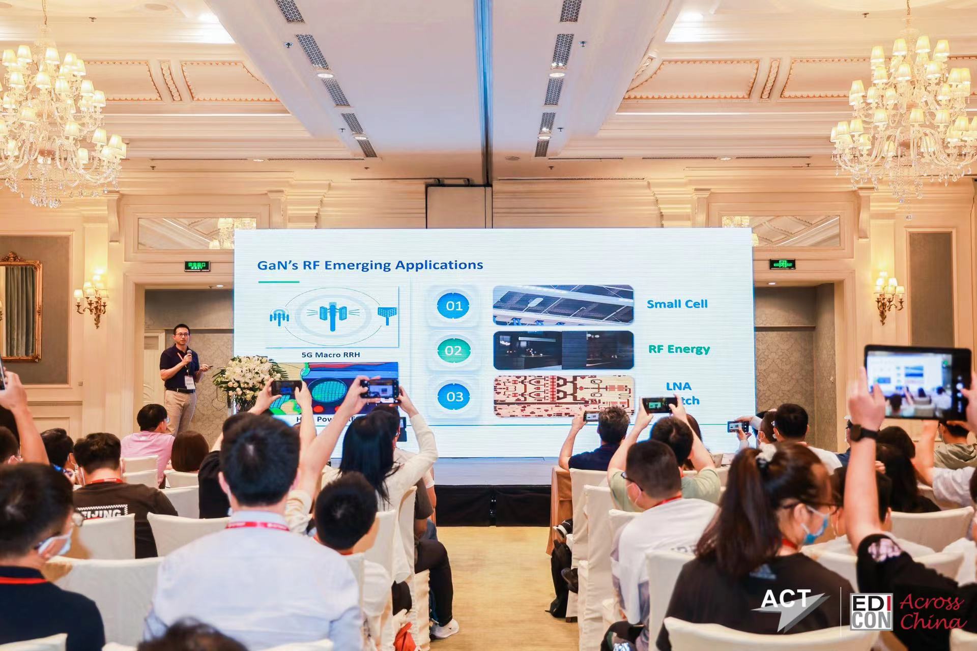 会议现场,能讯半导体射频产品中心总监刘鑫先生作《氮化镓工艺在射频新兴市场应用》的主题演讲,本次演讲分享和探讨未来氮化镓在5G小基站市场、射频能源市场以及LNA、RF Switch市场等潜在应用机会。